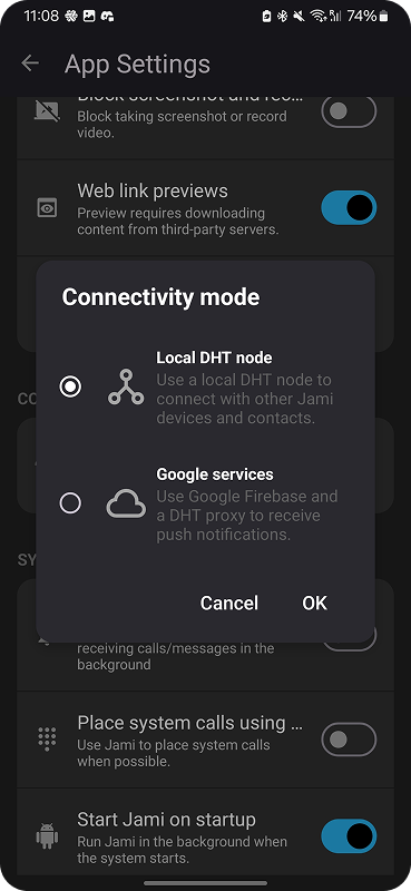 - Android: You can switch the app to Local DHT node mode to bypass Google servers.